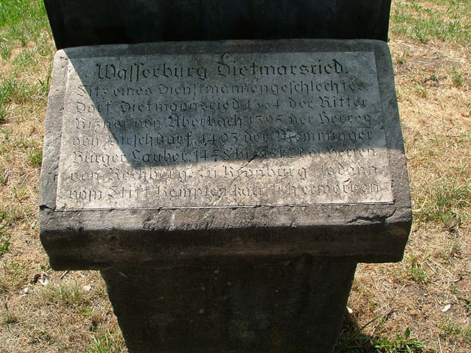 Etwa um 1100 hat ein unbekannter Dorfadel die Burg auf dem Inselweiher (Motte) errichtet. Erwähnt wurde Dietmannsried erstmals im Jahr 1349. Zur Frankenzeit schenkte Hildegard, Gemahlin Karls des Großen, dem Benediktinerkloster Kempten große Gebiete im Umkreis. Die spätere Fürstabtei (Stift Kempten) - sie bestand bis 1803 - war in Pfl egeämter unterteilt. Das Pfl egeamt Falken hatte von 1692 bis 1734 den Sitz in Dietmannsried (Haus Witt am Rathausplatz).