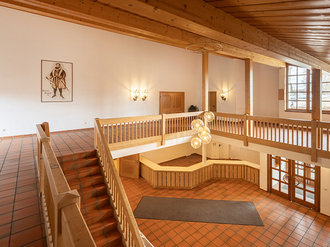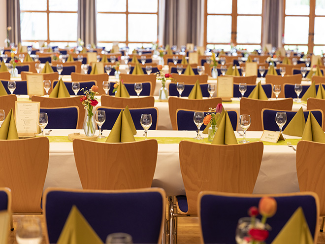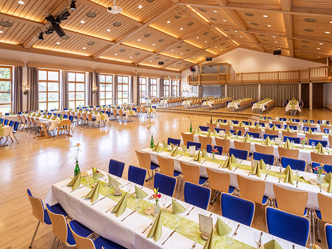 Bei Theateraufführungen auf der 100 qm großen Bühne finden im Saal zum Beispiel ca. 500 Zuschauer Platz. Da der Festsaal geteilt werden kann, sind auch Veranstaltungen in kleinerem Rahmen möglich.