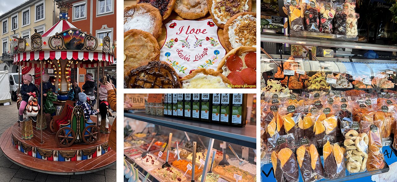 Für das leibliche Wohl der Marktbesucher ist auch gesorgt. Es gibt verschiedene Süßwaren so-wie Ungarische Langos, außerdem verschiedene Grillwürste wie Feuerwurst und Bratwurst.
