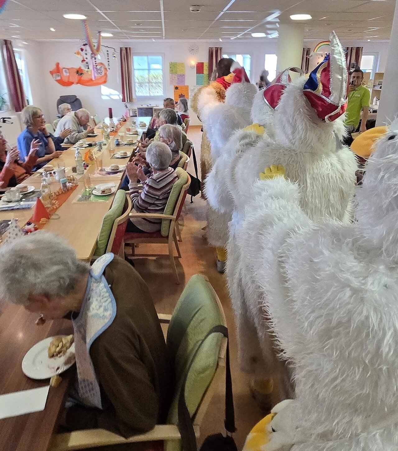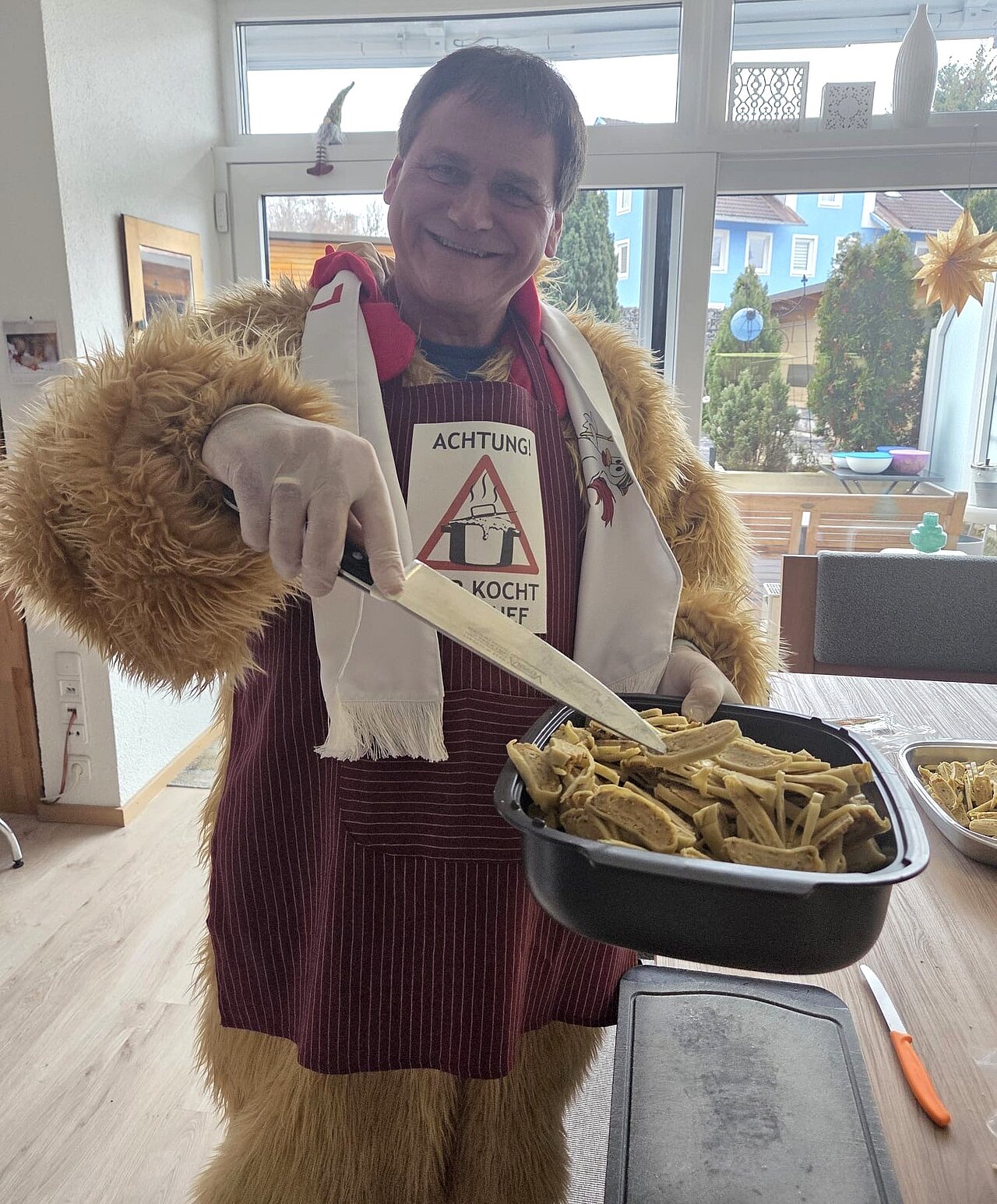 Bereits in der Früh des Gumpingen Donnerstags erhielt Erster Bürgermeister Werner Endres Aufgaben der FGD-Hennen. In diesem Jahr stand alles im Zeichen der Dienstleistung. Zunächst machten sich die Hennen samt Bürgermeister auf den Weg, um die Festhalle für den abendlichen Weiberfasching aufzustuhlen und zu dekorieren. Auch ein „Notfallkörbchen“ für die Damen wurde bereitgehalten. Anschließend kümmerte sich der Rathauschef um die Seniorinnen und Senioren der Tagespflege des Geschwister-Roth- Seniorenzentrums und überbrachte neben einer Büttenrede auch frische Krapfen. Anschließend bewies er sich wieder mal als gekonnter Hausmann beim Zubereiten verschiedener Speisen.